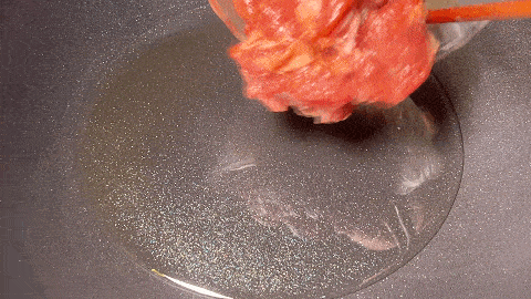 10. 起鍋加入植物油,油熱倒入肉片進行滑炒