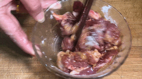 9. 淋入植物油,再次拌勻醃制10分鐘