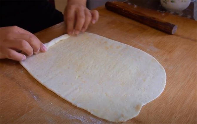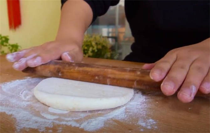 6.卷好之後再按扁,然後再搟開,反復這個步驟得三次,這個就是開酥的一個過程。