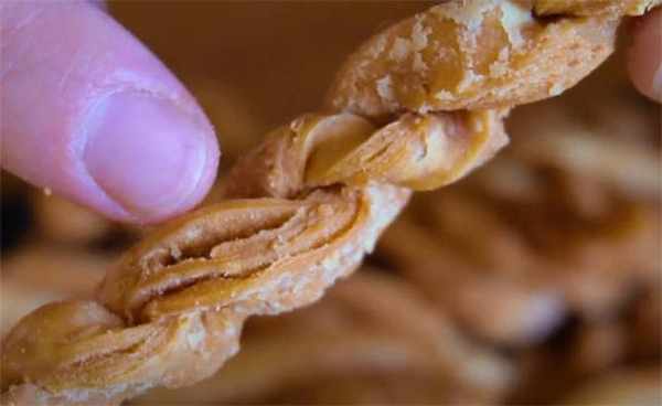 11.這個麻花終於炸好瞭,我們看看這個層次特別多,別看這小小一根,但是味道是絕對的好,特別酥脆,這個麻花吃起來咸咸香香的,加瞭芝麻特別的好吃,雖然咱們這個是油炸的,但是吃起來一點也不油膩。
