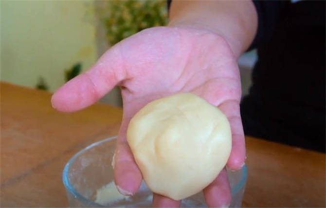 2.這時候做個油酥面,這是70g低筋粉,倒上35g的食用油,放瞭2g鹽調味,把面團提起來,在掌心揉勻揉圓瞭。