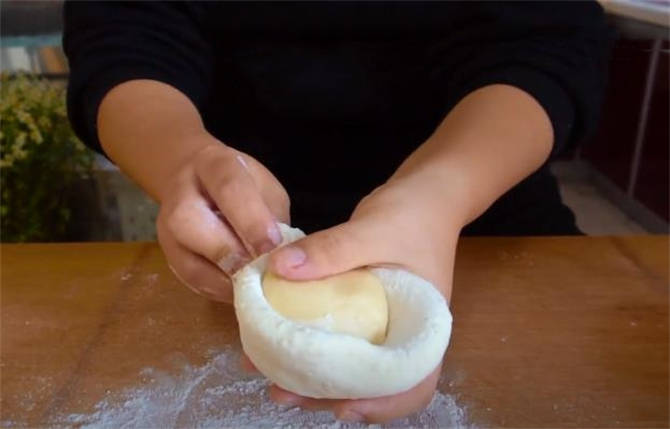 4.把剛才做好的油酥面取出來,用這個餅皮包上,收口的地方給收緊瞭。