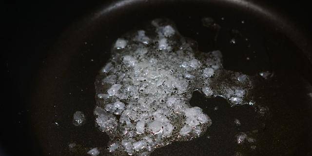 4、起鍋倒油,油熱後,保持中小火,將冰糖倒入鍋中炒化,建議:提前把冰糖敲碎,更容易融化,沒有冰糖,也可以用白糖代替。