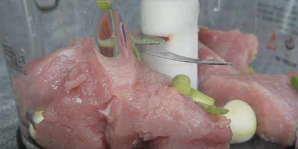 2.準備一塊豬肉放入絞肉機中,裡面加入三根蔥白,把它攪打成肉末。