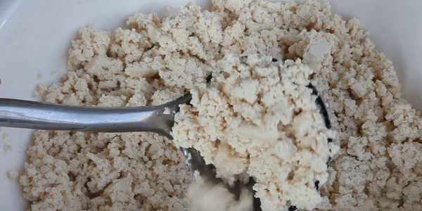 1.準備一塊老豆腐,用工具把它壓碎。放在一邊備用。