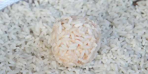 8.糯米平鋪在盤中,肉球在上面滾上一圈。然後再搓幾下,讓它貼嚴實一點。