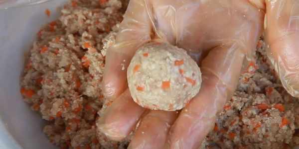 7.抓一撮餡料,把它團成跟雞蛋黃差不多大小的圓球。