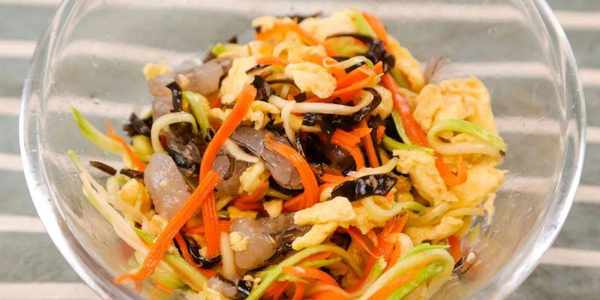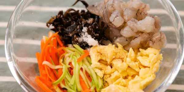 3.把蔬菜絲、雞蛋碎、木耳絲、蝦仁放入大碗裡,加入鹽、生抽混合攪拌均勻成餡料。