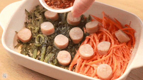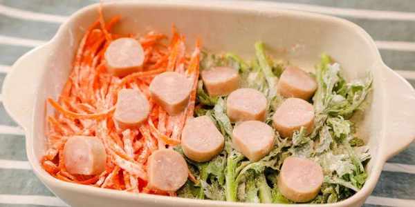 6.肉腸提前切小塊,蔬菜絲裹上少許面粉,表面放上肉腸。(Tips:裹面粉可以讓蔬菜吃起來有飽腹感,蒸熟後蘸醬吃會更美味)
