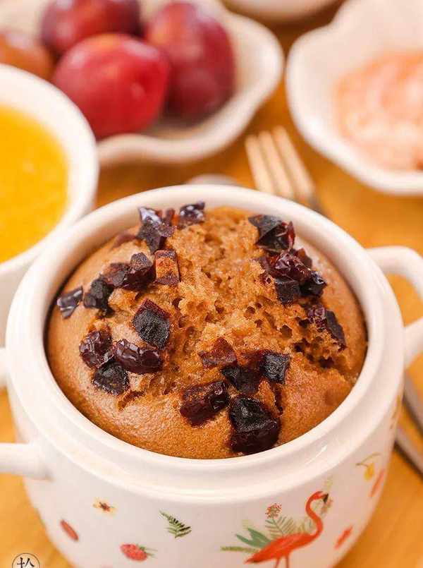 5.容器刷上植物油,倒入面糊7分滿,表面撒上少許紅棗丁;放入蒸鍋,蒸20分鐘。