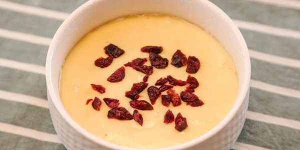 5.容器刷少許薄油,倒入玉米面糊,表面撒上少許蔓越莓碎,放入蒸鍋中,蒸20分鐘。