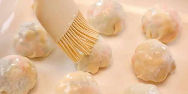 4.取一張餛飩皮,在中間位置放上餡料,像包包子一樣收口捏緊朝下;盤子提前刷上植物油,放入做好的小蒸包,包子表面再刷上一層薄油。