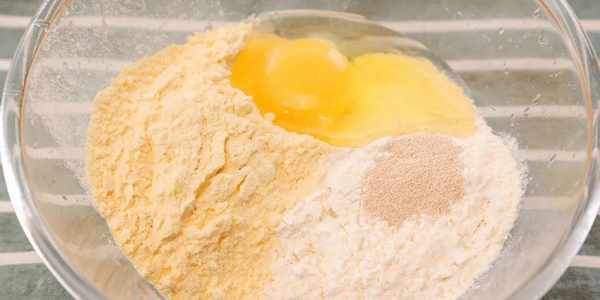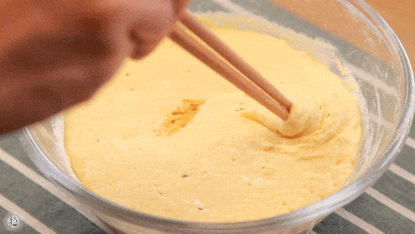 2.玉米粉和中筋面粉混合均勻,打入一個雞蛋,加入酵母粉,攪拌均勻成濃稠的面糊。(Tips:面粉吸水不同,如果面糊太幹攪不開,可以加入少許牛奶或清水調整)