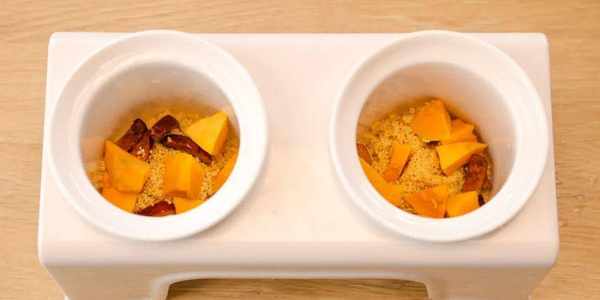 1.把洗凈後的小米放入燉盅裡,加入清水、南瓜、紅棗肉,放入蒸鍋中,選擇蒸煮功能(約30分鐘)。