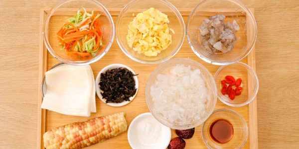 銀耳/10g、紅棗/2顆、枸杞/適量、木耳/2g、胡蘿卜、角瓜絲/150g(提前用鹽醃制變軟擠掉水份)、雞蛋碎/1個、蝦仁/50g、餛飩皮/適量、生抽/1勺(約5g)、鹽/1勺(約2g)、糯玉米/1個