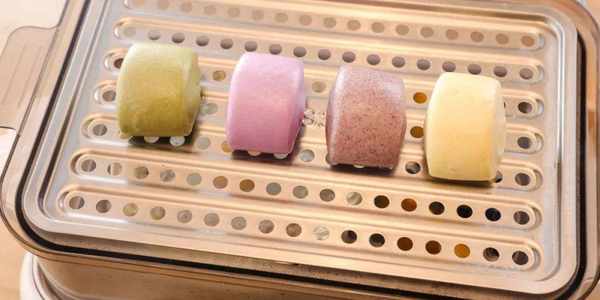4.15分鐘後加一層蒸屜,放入小饅頭,繼續蒸10分鐘。
