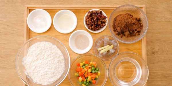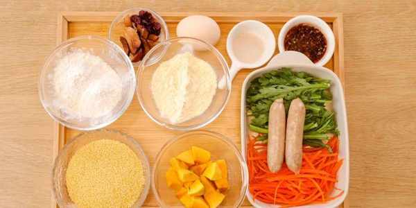 茼蒿/100g、胡蘿卜絲/100g、肉腸/2根、南瓜/100g、小米/100g、紅棗肉/適量、雞蛋/1個、蒜蓉生抽/20g(一勺蒜蓉和少許生抽混合)、玉米粉/50g、中筋面粉/50g、酵母/1.5g、蔓越莓碎/適量