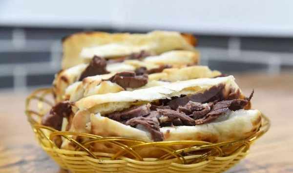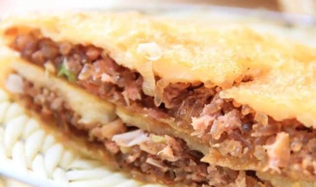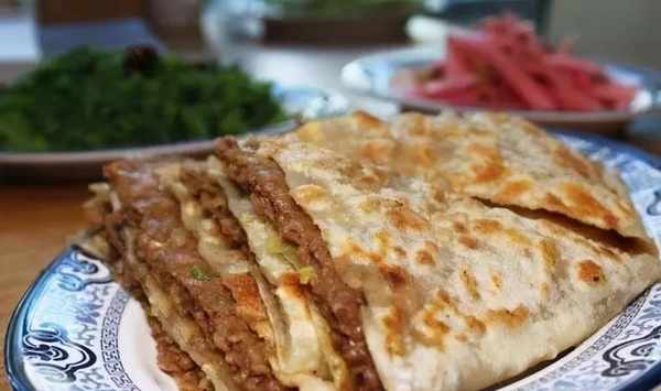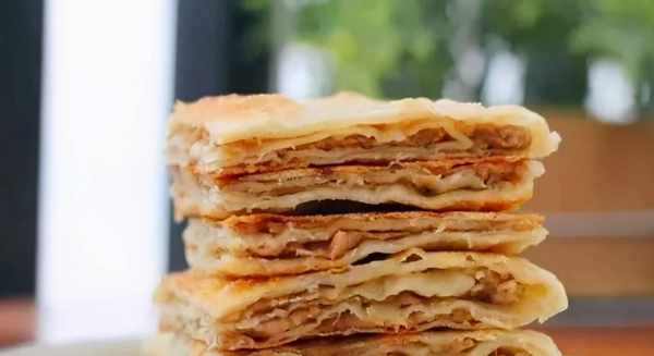 把牛肉肉盒切成四塊,放在小籃子裡拿上桌。肉餡粉條充盈飽滿,入口酥脆,不油不膩,搭配著胡辣湯,吃得舒爽自在。