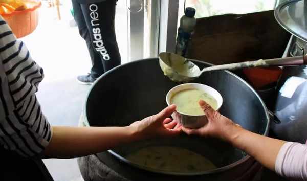 一大盆剛剛熬好的胡辣湯,熱氣騰騰。木頭長勺在裡面一kuai,盛入碗中。