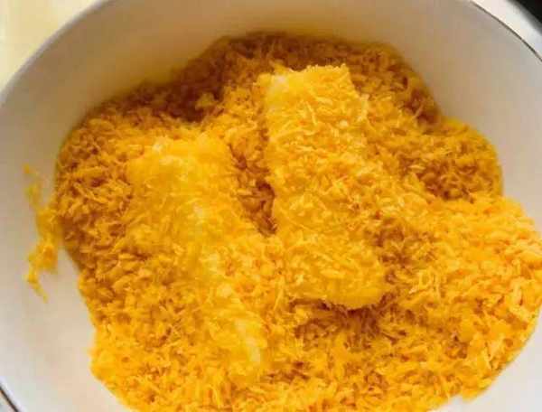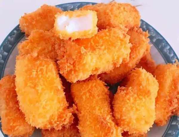 3、牛奶條先入雞蛋液裡包一圈,又粘上面包糠更容易,在空氣炸鍋裡炸時,一滴油都不用,具體時間及溫度需根據實際條件而定,當然,要是下油鍋炸的話,切記油溫應在七成熱時下油鍋,不容易吸油或糊化,炸到金黃香脆即可出鍋。