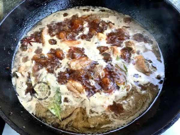3、上糖後放入焯過水的肉炒勻上色,晚期加水時,必須加沸水,若加冷水,可使肉發幹,不容易燉爛,影響味道。