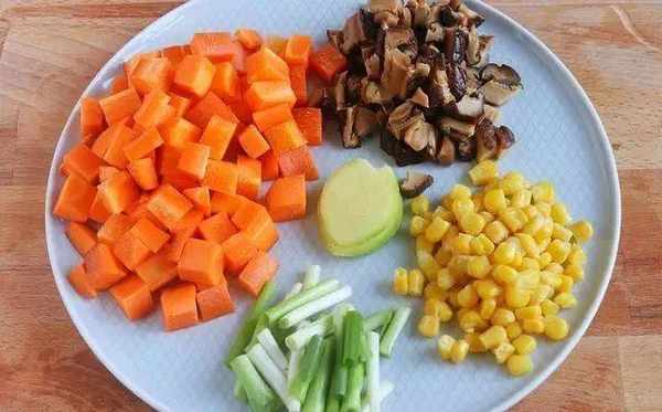3、胡蘿卜去皮,洗凈,切一厘米大胡蘿卜丁,再將甜玉米的玉米粒剝落用水沖幹凈,香菇切成丁,與胡蘿卜丁相仿,香蔥切成約兩厘米長的蔥花,薑切片。