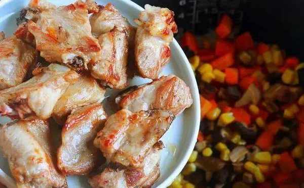 5、吸飽水後取出大米粒,鋪於電飯煲內膽底部,又把胡蘿卜丁、香菇丁、甜玉米粒,放一起吃,再將炒排骨放在時蔬粒上。