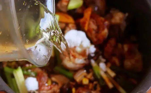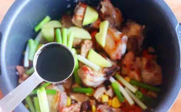 6、將生薑片、香蔥段放在排骨段最上層,接著往鍋裡依次放入2湯匙醬油和1湯匙料酒、1湯匙老抽,2湯匙綿白糖。