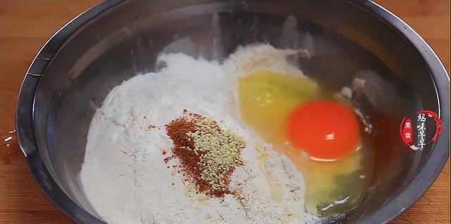 2,盆裡倒入100克面粉,在加入30克玉米淀粉,一勺鹽,一勺五香粉,一勺雞精,一小勺小蘇打,打入一個母雞蛋,接著少量分次倒入清水,把它和成面糊,如果有面疙瘩的話可以用勺子邊攪邊壓,攪拌成這樣比酸奶略稠的面糊就可以瞭。