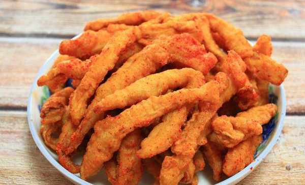 6,炸好的杏鮑菇加入孜然粉,辣椒面翻拌均勻就可以享用瞭。
