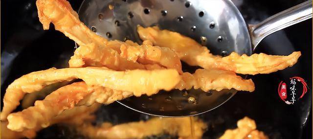 5,油溫繼續升高,然後把杏鮑菇在復炸一下,差不多10幾秒就可以瞭,這一步主要為瞭炸出的杏鮑菇更加酥脆