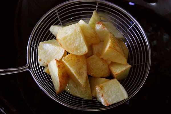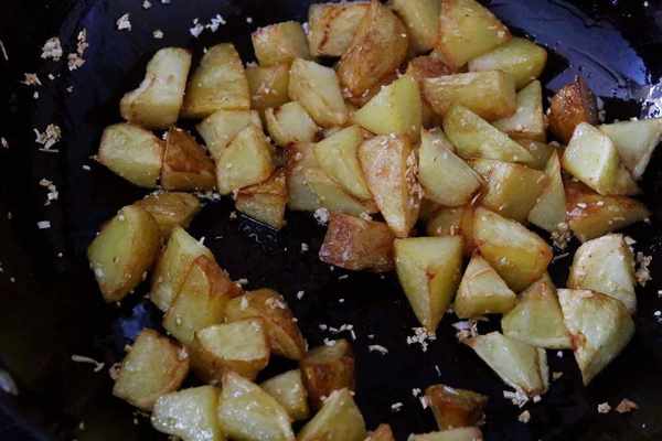 2.鍋中放油燒熱,把洋芋塊放入鍋中炸至表面金黃後撈出️。