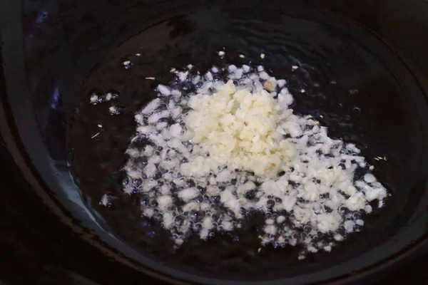 3.鍋中留底油,燒熱後下蒜末,炒出香味。