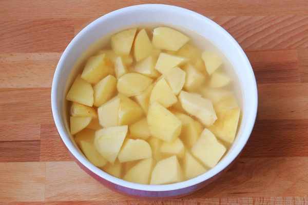 1.洋芋洗淨,去皮切塊,在凉水中泡一會去除澱粉,然後瀝幹水分,蒜切末備用️。