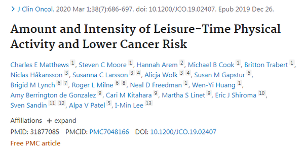 為瞭解15種癌症風險與運動之間的關係,美國國家癌症研究所對75萬名成年人的9項前瞻性研究進行匯總分析,並刊登在著名醫學雜誌《臨床腫瘤學雜志》上。