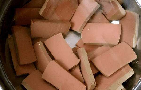 3、將豬血糕切成約1厘米的薄片,放入鍋中加適量水小火煮約5分鐘,撈出瀝幹備用。