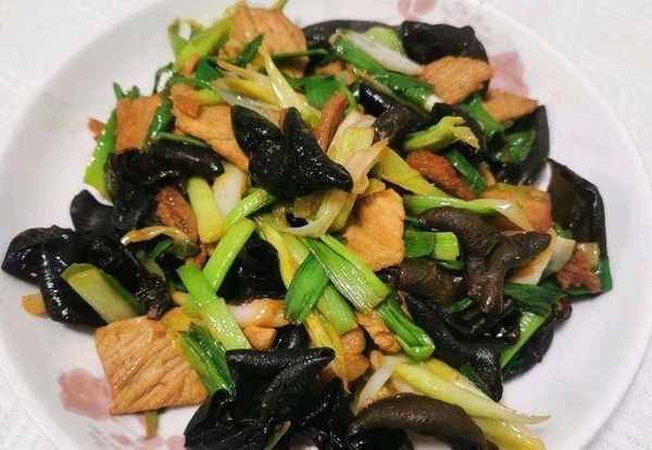 3,肉炒香後,放入一點生抽,醋,接著倒入青蒜和木耳,炒熟之後加鹽和雞精調味就可以出鍋瞭。
