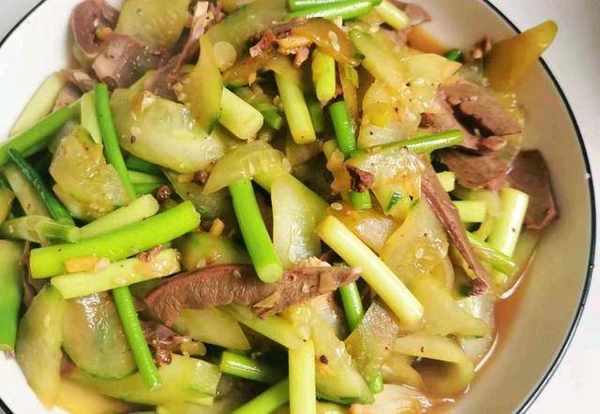 3,豬心炒入味後,倒入蒜苔和黃瓜片,大火爆炒一分鐘左右,加鹽和雞精調味就可以出鍋瞭。