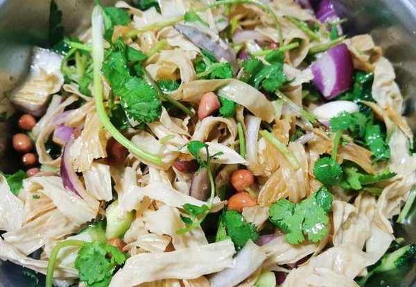 洋蔥,黃瓜,油豆皮,香菜,油炸花生米,蒜,生抽,醋,白糖,鹽,食用油