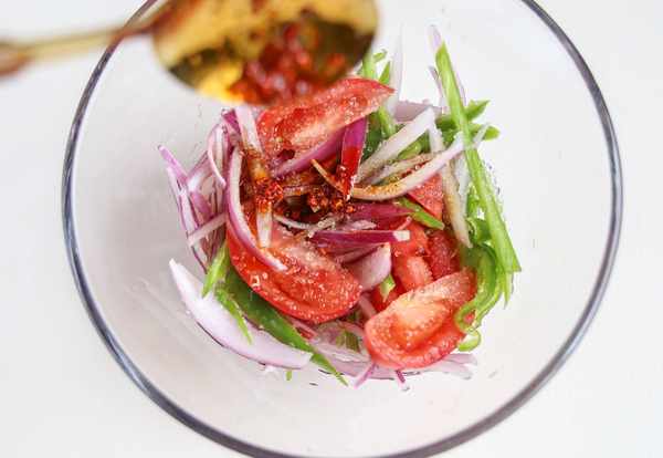 對新疆人來說這道涼菜在新疆知名度應該僅次於大盤雞,是夏季餐桌必備的涼菜。皮辣紅這道菜,做起來簡單,但卻是一道正宗味美的新疆“硬菜”。紅、綠、白三色相間惹人垂涎;吃起來有洋蔥的脆爽,還有西紅柿的酸甜和青辣椒的辛辣,令人胃口大開、食欲大增。