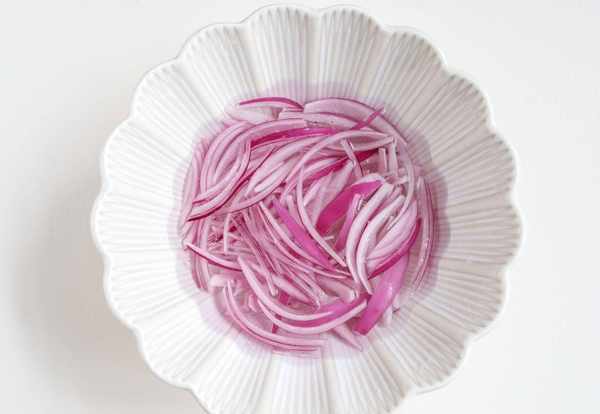 1.洋蔥切絲,泡水10分鐘,目的是降低洋蔥辣味