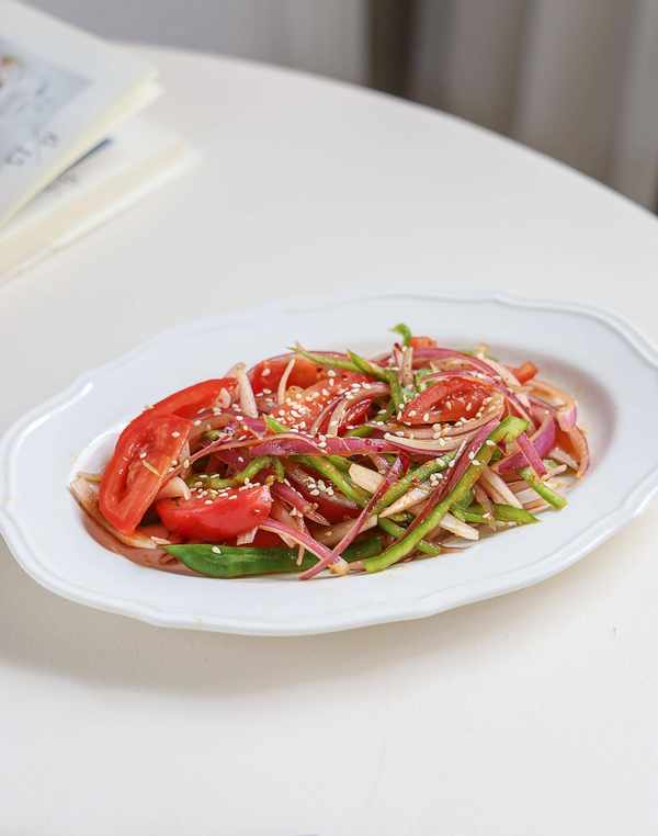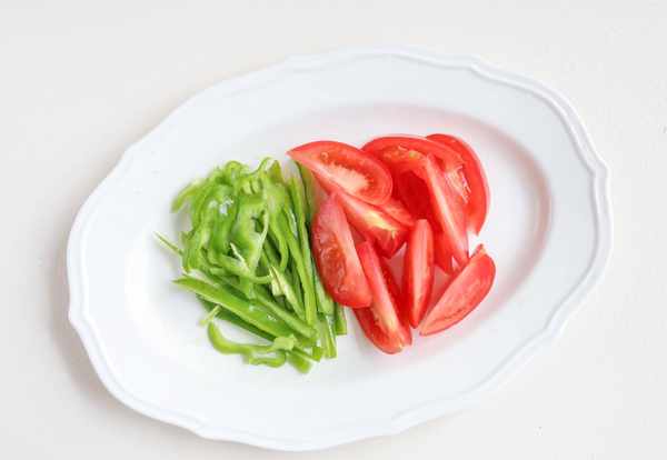 2.辣椒切絲,辣辣的感覺更爽口。要是不能吃辣的,也可以用青椒絲代替。西紅柿洗凈,對半切開