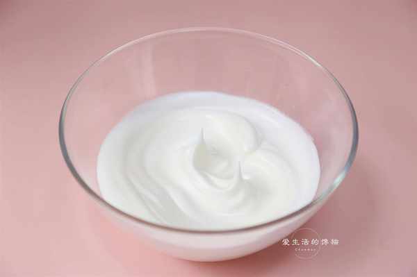 3,蛋清+細砂糖+幾滴檸檬汁攪打到出現短小尖角的狀態。