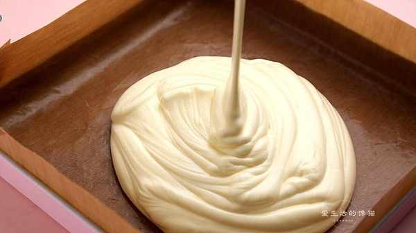 5,把蛋糕糊倒入28*28的金盤裡,鋪平後震出氣泡。