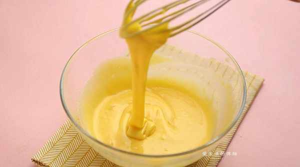 2,雞蛋分離出蛋黃放入面糊拌勻到絲帶狀,蛋清可以提前放入冰箱冷凍15分鐘到邊緣出現冰渣,這樣可以讓蛋白更穩定。