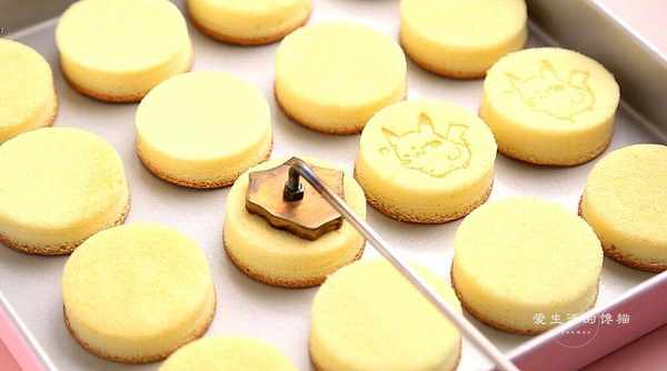 7,出爐後的蛋糕片放涼脫模,用圓形餅幹模具切成片,燒熱烙鐵後印在蛋糕面上。