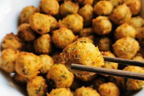 將蘿卜丸子放入油鍋時要小心哦,不要讓手指碰到油,也要防止丸子入鍋時油發生崩濺;