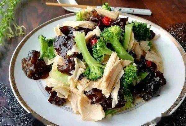 食材:西蘭花300克、腐竹200克、蒜蓉10克、蠔油2勺、鹽少許、醋2勺、雞精少許、芝麻油1勺