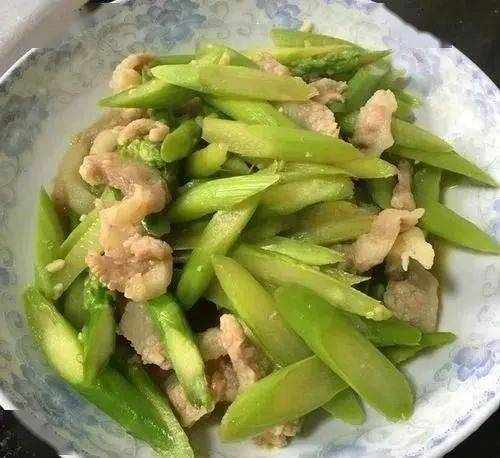 所需食材:蘆筍200克 豬瘦肉150克 薑1片 大蒜1瓣 食用油適量