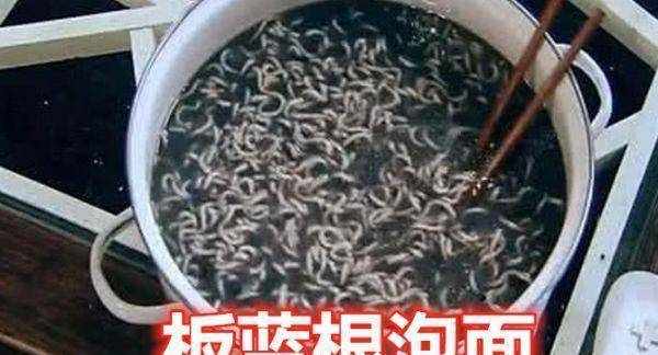 然後就是板藍根泡面,泡面中加入板藍根,說是起到防止上火的作用,想想是有這個道理。但是,光看這個泡面的顏色,就讓人難以下咽。能吃下這個的,真是重口味!